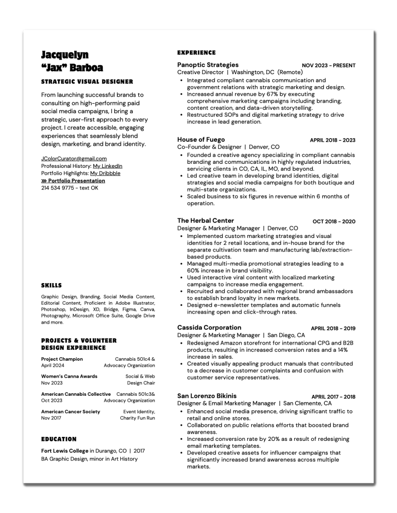 Jax Barboa is a versatile and innovative graphic designer with over eight years of experience in corporate branding, creative direction, and marketing, particularly within the CPG and startup sectors. As the Creative Director and Designer at Panoptic Strategies, Jax leads dynamic teams in crafting compelling narratives and visually striking identities that resonate with diverse audiences. Her background spans a broad array of skills, including content creation, web design, event management, and social media marketing, supported by extensive proficiency in platforms like Adobe Creative Suite, Canva, Asana, and Shopify.